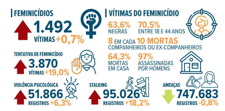 No Brasil, em 2024, 1.492 mulheres foram vítimas de feminicídio e 822 mil foram estupradas, sendo que a maior incidência de estupros é entre as jovens, com destaque para meninas de 13 anos. Os principais agressores são familiares, parceiros e ex-parceiros, amigos e conhecidos, tanto nos casos de violência física quanto nos de violência sexual.
